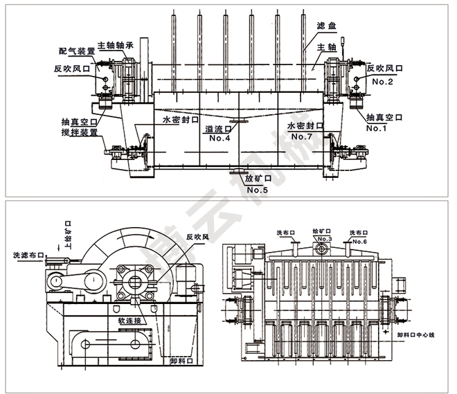盤式真空過濾機由各個單獨的扇形片的圓盤構(gòu)成。每一個扇形片為 單獨的過濾單元,由濾布做成布套在扇形片上形成濾室。過濾盤由電機通過減速器及開式齒輪傳動來驅(qū)動 ,過濾盤順時針方向轉(zhuǎn)動,濾室里的礦漿在吸附區(qū)借助于真空泵在過濾介質(zhì)兩側(cè)形成的壓力差,附著在過 濾盤上形成濾餅后,攪拌器旋轉(zhuǎn)防止固體沉淀,濾餅離開液面后,在真空作用下繼續(xù)脫去水分。濾液透過 濾布,經(jīng)過濾液管,從分配頭排出。濾餅在卸料區(qū)由反吹風卸料落入排料槽,整個作業(yè)過程連續(xù)循環(huán)進行 。
